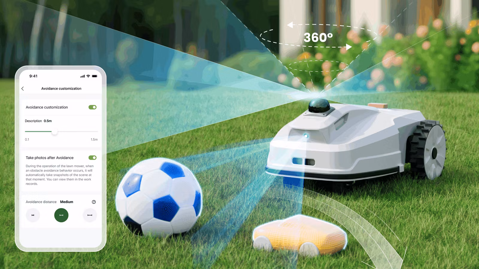 Stenar, leksaker eller trädgrenar – FL3000 LiDAR-robotgräsklipparen upptäcker hinder innan problem uppstår. Med LiDAR och visionsteknik, den navigerar säkert och dess detekteringshöjd kan enkelt justeras för olika scenarier i appen.